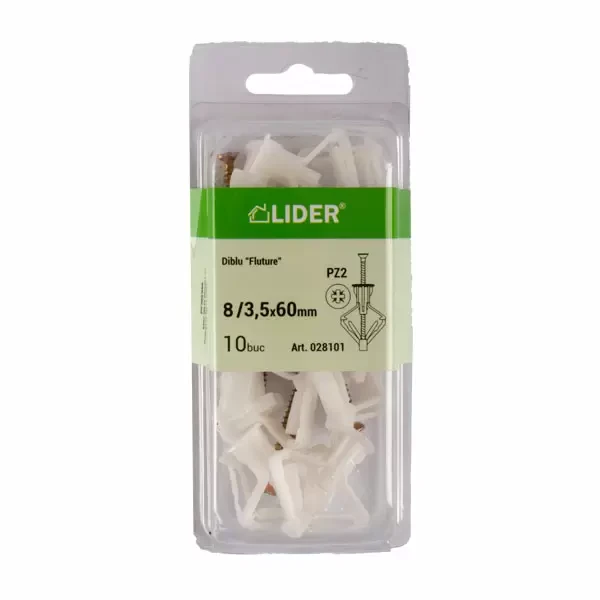 Diblul "Fluture" de mărimea 8 cu un șurub de 3,5x60 mm și cap de tip PZ (Pozidriv) este destinat fixării obiectelor ușoare pe pereți din gips-carton și alte structuri cavitate. Acest tip de diblu are "aripi" care se deschid pentru a oferi o ancorare suplimentară în interiorul peretelui cavitar, prevenind extragerea diblului din material.