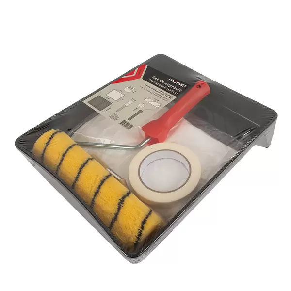 Setul de zugrăvit este un kit complet de unelte necesare pentru efectuarea oricăror lucrări de vopsire. Setul include: tavă pentru vopsea, trafalet, pensulă, folie de protecție și bandă de mascare. Acest set este proiectat pentru aplicarea comodă și precisă a vopselei pe diverse suprafețe, asigurând un rezultat de calitate. Toate uneltele sunt selectate pentru a oferi confort maxim și eficiență în timpul vopsirii. Folia de protecție și banda de mascare protejează zonele care nu trebuie vopsite, în timp ce trafaletul și pensula asigură aplicarea uniformă a vopselei.