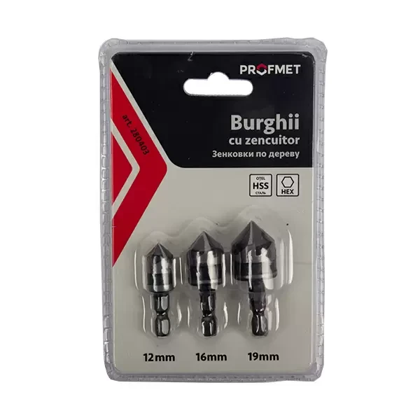 Set de burghie cu zencuitor, pentru lemn - este un set de unelte destinate prelucrării găurilor în materialele din lemn. Setul include trei conuri cu diametrele de 12, 16 și 19 mm, oferind universalitate și permițând alegerea dimensiunii potrivite pentru fiecare sarcină. Conurile sunt fabricate din oțel rapid (HSS), asigurând rezistența, durabilitatea și performanța înaltă în lucrul cu lemnul. Tija hexagonală asigură fixarea ușoară și sigură în bormașină sau șurubelniță, prevenind alunecarea în timpul lucrului.