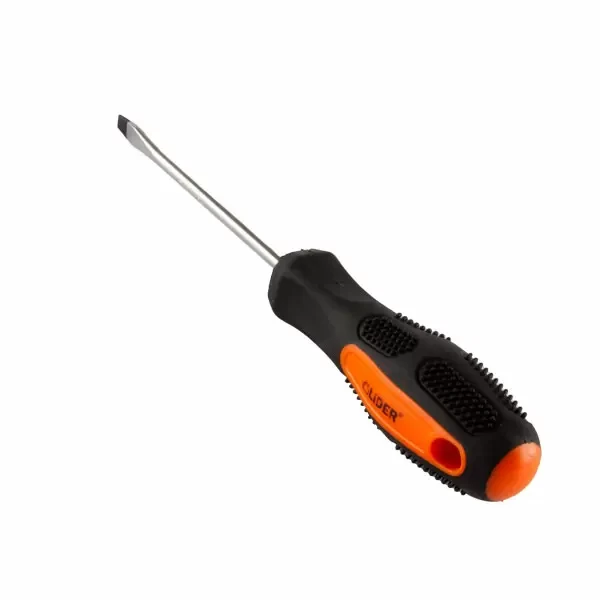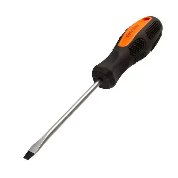Șurubelniță SL cu mâner cauciucat și vârf din oțel crom-vanadiu (CrV) este un instrument universal conceput pentru lucrul cu elemente de fixare ce au o singură canelură (șurub cu cap plat). Partea activă din oțel crom-vanadiu asigură durabilitate, rezistență la uzură și la coroziune. Mânerul cauciucat oferă o prindere confortabilă și sigură, facilitând transmiterea eficientă a forței și reducând oboseala mâinilor în timpul utilizării prelungite.