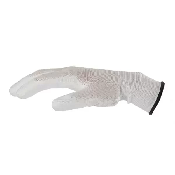 Mănuși din poliester, tricotate după tehnologie fără cusături, impregnate parțial cu poliuretan și manșetă tricotată.